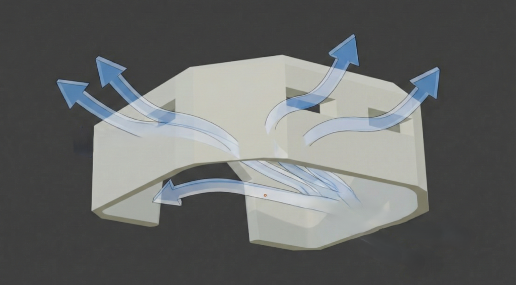 電気を使わずに、シェルター内の空気が常にゆっくりと循環し続けます。「空気の死に場所」がなくなり、カビが好む「ジメジメした淀み」が解消されるのです。